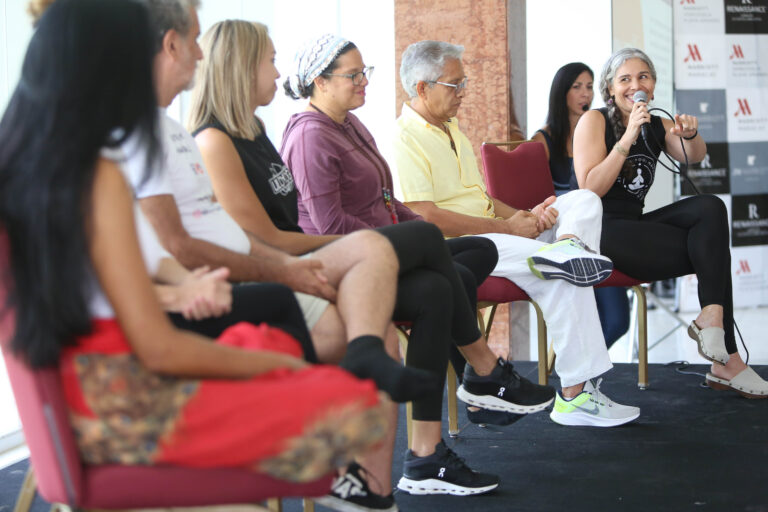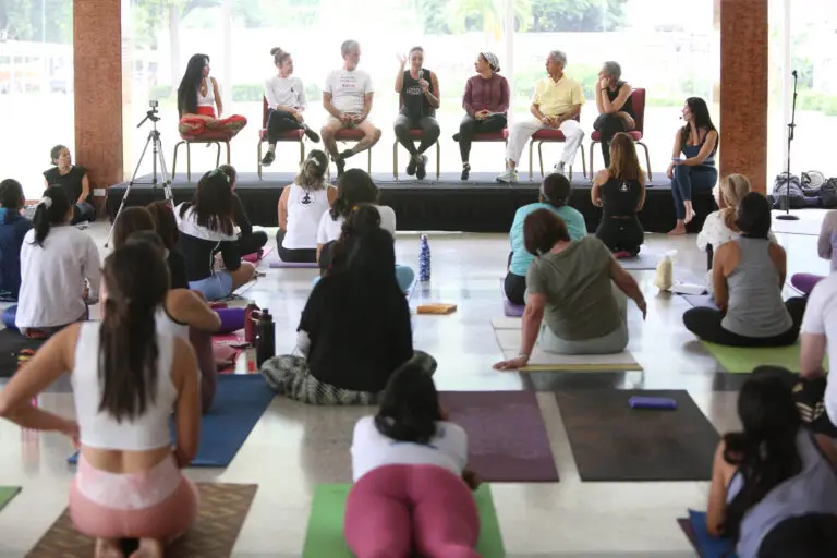 Estuvieron presentes más de 100 prácticantes y profesores de Yoga, hubo variedad de clases de diferentes estilos de Yoga, charlas filosóficas, danza y música con Handpan, y quizá, lo más importante, el conversatorio con el Panel de Profesores abierto al debate con el nombre «Yoga y Como-unidad»